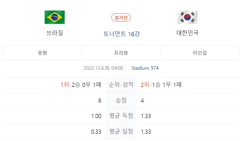 12월 6일 화요일 AM 4:00에 만나는 브라질과의 16강전!